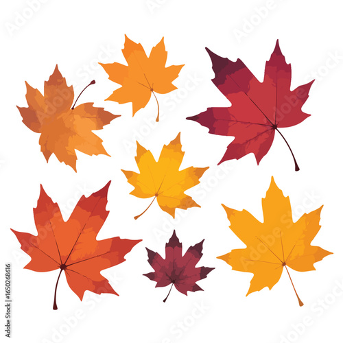 Assorted maple leaves in red, orange, and yellow hues create a seasonal vector graphic, perfect for autumn-themed design projects and backgrounds.