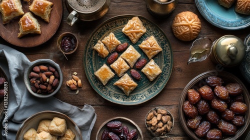 Assorted pastries and dates on a wooden table.