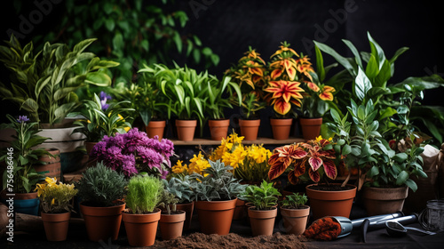 Assorted potted plants and flowers on a dark background with gardening tools.