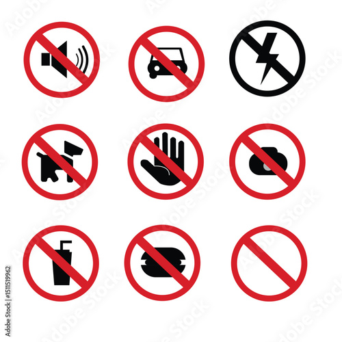 Assorted Prohibition Signs: A grid of various black and red prohibition sign icons symbolizes restricted action and caution, conveying a message of dos and don'ts