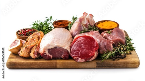Assorted raw meats displayed on a wooden cutting board with fresh herbs and condiments on a white background for culinary use