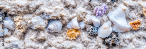 Assorted sea shells and coral pieces on sandy beach surface with ocean texture