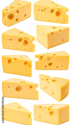 Assorted triangular and rectangular slices of dairy product featuring varying sizes and numbers of air pockets against a white backdrop