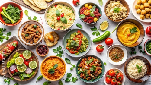 Assorted vegetarian dishes with empty space for text on a white background , plant-based, vegetarian, vegan