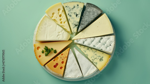 Assortment of cheeses of different variety, colors and textures. A range of premium expensive cheese. Wallpaper with lots of pieces of moldy cheese.