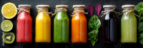 Assortment of colorful fruit and vegetable smoothies in glass bottles displayed on a dark surface