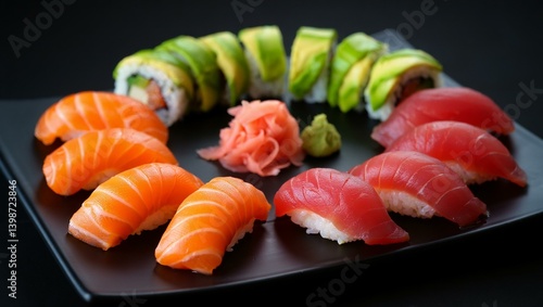 Assortment of colorful sushi rolls and nigiri on a dark plate, close up view