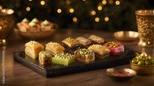 Assortment of delicious baklava pastries, beautifully arranged on a dark tray. Gold accents and a festive bokeh background create a luxurious feel, perfect for celebrations.