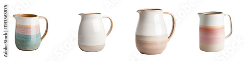 Assortment of Handcrafted Ceramic Pitchers and Mugs with Pastel Tones and Rustic Textures