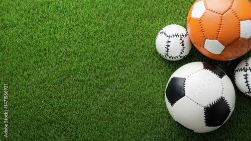 Assortment of leather sports balls on green artificial turf, including soccer ball, baseball, and a unique orange ball. : Generative AI