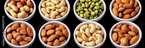 Assortment of nuts in white bowls, including almonds, cashews, peanuts, and hazelnuts.