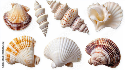 Assortment of seashells in different shapes and sizes, isolated on white background