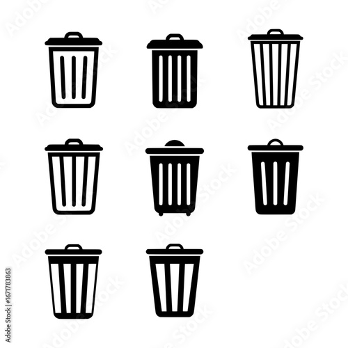 Assortment of simple black silhouette trash can illustrations with lids and varying striped patterns on a clean white background.