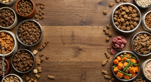 Assortment of various pet food types in bowls on a rustic wooden table