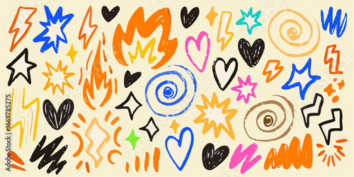 Assortment of vibrant hand-drawn doodle icons and symbols on a pale background abstract