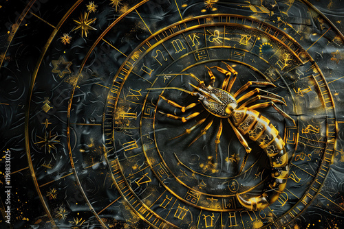 Astrological abstract composition with concept of Scorpio zodiac sign symbol, abstract vivid composition consists of fictional unreal fantastic vision on background