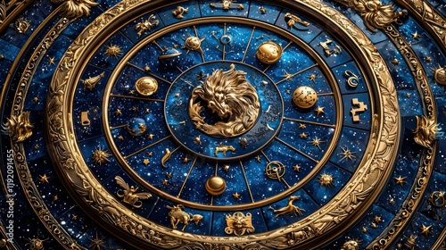 Astrological design with zodiac symbols and motifs.
