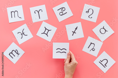 Astrology concept. Twelve zodiac signs in horoscopic wheel, top view