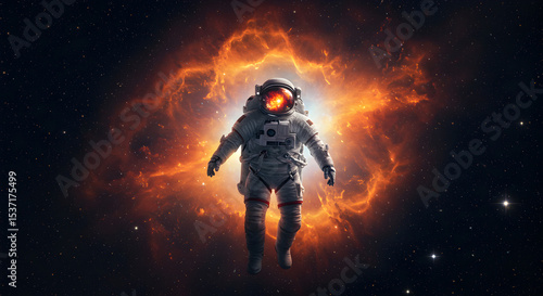 Astronaut adrift in a cosmic nebula bathed in vibrant celestial light display