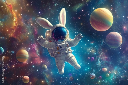 Astronaut bunny exploring vibrant outer space with colorful planets