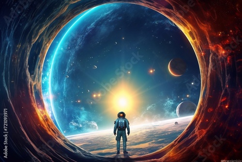 Astronaut cosmonaut discovery of new worlds of galaxies panorama, fantasy portal to far universe. Astronaut space exploration, gateway to another universe