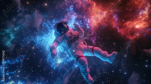 Astronaut Drifts in the Colorful Nebula, A Dance with Stardust Amidst the Cosmic Infinity. Solitary Spacefarer Explores the Vibrant Mysteries of a Distant Nebula.