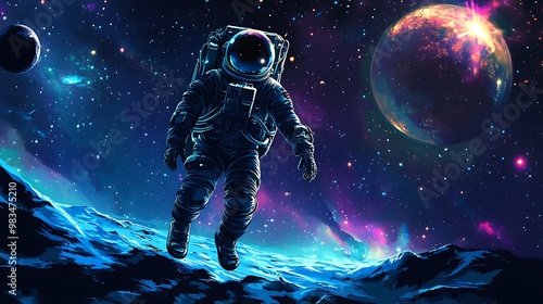 Astronaut floating in a vibrant cosmic landscape with planets and stars.