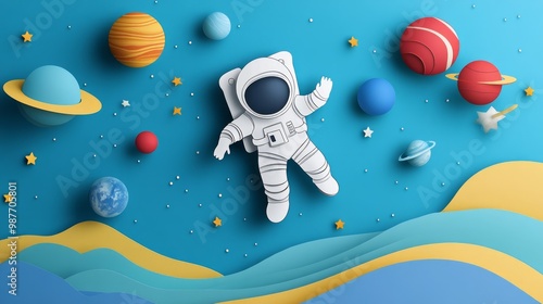 Astronaut floating in space paper cut on blue background great for space exploration-themed children’s book illustrations or adventure visuals