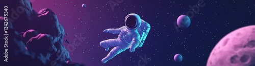 Astronaut floats in vibrant space nebula near planets and asteroids.