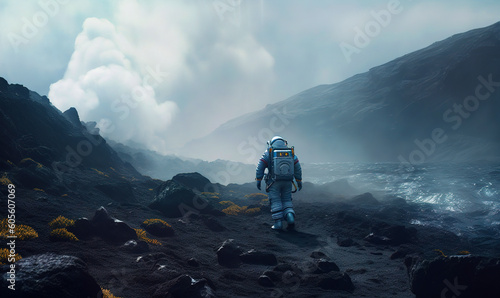 Astronaut in costume walking. Astronomy spaceman in helmet and suit. Generative AI.