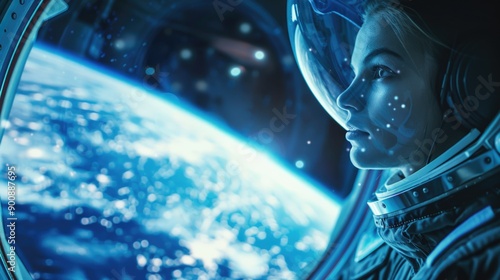 Astronaut in space suit looks out of spaceship window, possibly checking on planet or stars