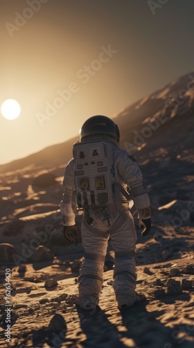 Astronaut on a Rocky Extraterrestrial Terrain at Sunset