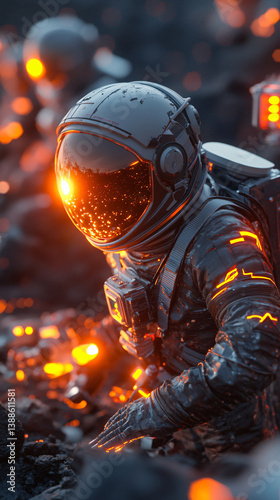 Astronaut Space Exploration: Futuristic Sci-Fi in a Cosmic Galaxy with Alien Landscape and Glowing Planet Surface