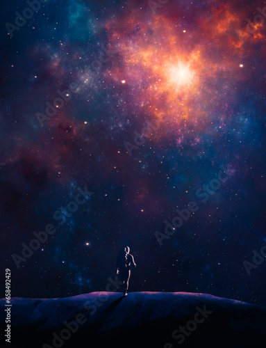 Astronaut walking on mountain landscape with fractal nebula and stars. Fantasy digital painted background, 3D rendering
