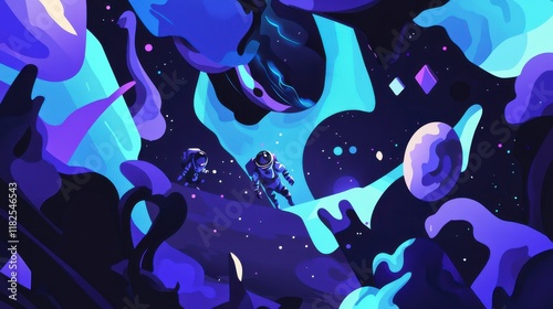 Astronauts Exploring a Colorful and Fluid Outer Space. A Dreamlike Nebula Landscape. A Vibrant Cosmic Journey