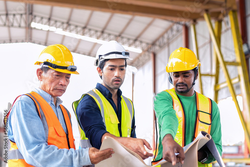 At construction site engineer check drawing correctness concrete mold before pouring concrete