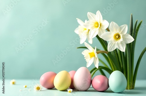At the left side of image in pastel colours lie realistic narcissus flowers bouquet and Easter eggs concept. Place for text at centre