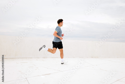Athlete sprints across a minimalist rooftop at dusk, showcasing determination and energy against a cloudy sky