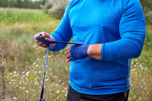 athlete stand and wrap his hands in blue textile elastic bandage before training