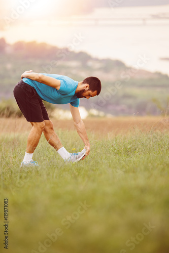Athletic runner doing stretching exercise, preparing for running in the nature with the city in background. Healthy lifestyle