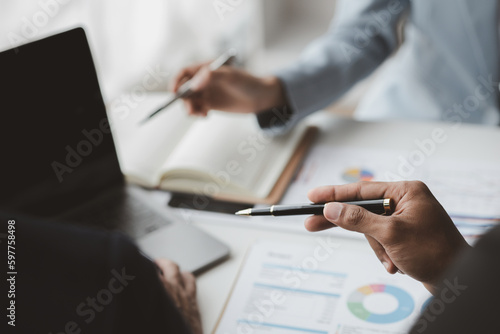 Atmosphere of a startup company meeting, business people are meeting together to summarize and plan investment finances, they are the founders of the company. Business administration concept.