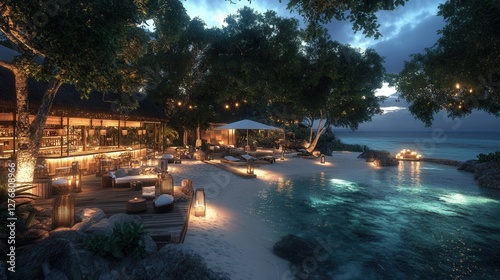 Atmospheric beachfront bar with a lounge area by the ocean at sunset, featuring plush sofas, a wooden deck, and lanterns.