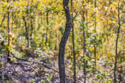 Atmospheric view of autumn romantic forest with backlight. In the middle of the photo is a focused tree trunk. Autumn outdoor background.