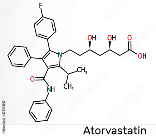 Atorvastatin, statin molecule. It is used for lowering blood cholesterol and for preventing cardiovascular diseases. Skeletal chemical formula