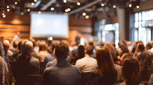 Attentive Audience at Modern Business Conference: Rear View, Warm Lighting, Engaging Presentation