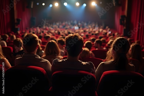 Attentive Crowd Watching Event in Dark Theater with Red Seats