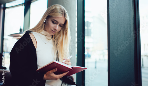 Attentive woman writing book and enjoying music in cafe
