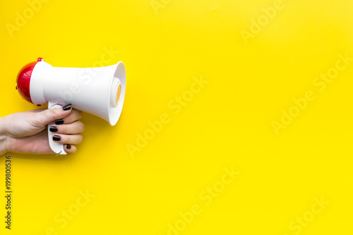 Attract attention concept. Megaphone in hand on yellow background top view copy space