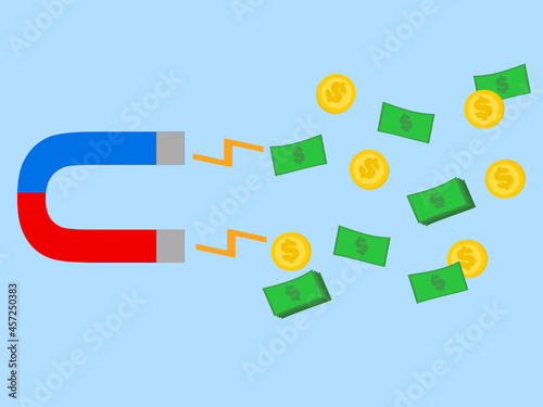 Attracting investments.Magnet, banknotes, money and coins.Successful business or profit concept.Tax, income, debt, economic and financial.Sign, symbol, icon or logo.Cartoon vector illustration.