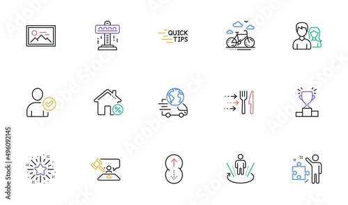 Attraction, Education and Identity confirmed line icons for website, printing. Collection of Twinkle star, Delivery service, Bike rental icons. Augmented reality, Judge hammer. Vector
